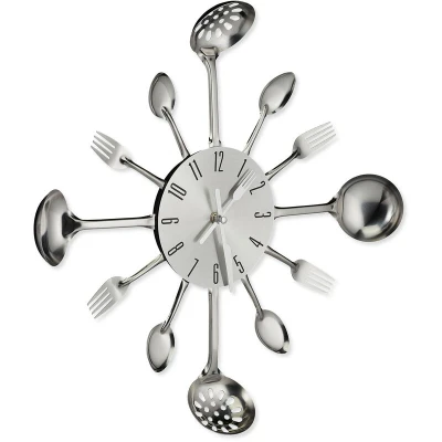 AmazonFunny: Original kitchen wall clock in cutlery design - Spoons, forks and ladles mark the full hours Round: Analogue clock for the wall with a diameter of approx. 40 cm - Always keep an eye on the time Decorative: Cutlery clock is a great eye-catcher in the kitchen, dining room or in the restaurant Battery operated: The kitchen wall clock requires one AA battery to operate (not incl. in delivery) Practical: Kitchen clock - Knife and fork as hour and minute indication hands - With ticking sound