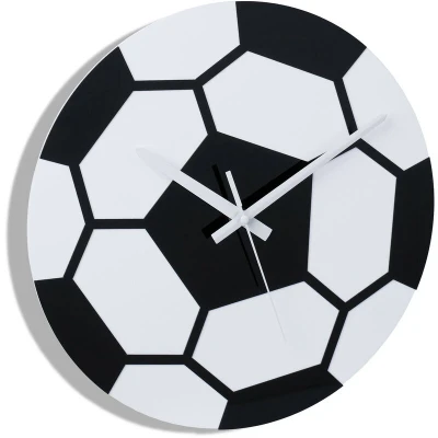 General description This football-themed wall clock is a perfect fit for young football fanatics who want to keep track of the time. With its simple design without numerals, this black and white room clock is sure to bring joy to all football fans. Technical specifications Diameter: 30 cm Thickness: 4 cm Weight: 200 g Power: Requires 1x AA battery (not included) Material: Plastic, iron Color: Black, white Installation Easy to hang on the wall with the rear hanging feature Usage Ideal decoration for children's and teenagers' rooms Perfect for all football fans, young to old Battery-powered clock with minute, hour, and second hands Other information Included in delivery: 1x Football wall clock (batteries and decorative items are not included)