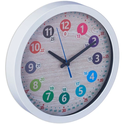 With this colourful children's wall clock, learning to tell time is easy and fun for kids. Reading the time is made easier by the large colourful numbers, the division into a 12- and 24-hour format, and the detailed minute labeling. The children's learning clock with a white plastic frame is suitable for both boys and girls and is not only perfect for the children's room but also for the playroom, classroom, or kindergarten. Children's Wall Clock in Detail - Dimensions D x T: approx. 30 x 4.5 cm- Weight: approx. 500 g- Requires 1x AA battery (not included)- Material: Plastic, aluminium- Colour: White, beige, colourful Wall Clock for Learning - Ideal for children's rooms, playrooms, classrooms, or kindergartens- Colorful design catches children's attention and makes learning easier- With times from 1 to 12 and 13 to 0 o'clock as well as precise minute labeling- Battery-powered kindergarten clock with minute, hour, and second hands- White case made of sturdy plastic - designed for boys