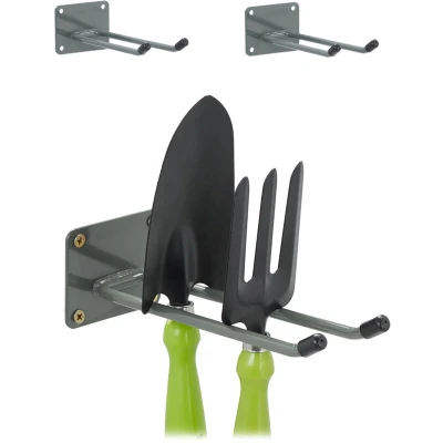 General description These Relaxdays Wall Hooks are designed to bring order to your garage, workshop, or cellar. With a set of three long, double hooks, you can easily hang brooms, rakes, shovels, and other tools, keeping them within reach and organized. The robust steel construction ensures durability, while the protective caps prevent tools from falling. Ideal for maintaining a tidy space, these hooks come with all necessary mounting materials for easy installation. Technical specifications Dimensions (H x W x D): 7.5 x 9 x 24 cm Distance between hooks: approx. 4 cm Diameter of each hook: approx. 1 cm Maximum load: 25 kg Weight: approx. 370 g Material: Steel, plastic Colour: Anthracite Installation Includes screws and wall plugs for wall mounting. Simply attach the hooks to the wall using the supplied mounting materials.