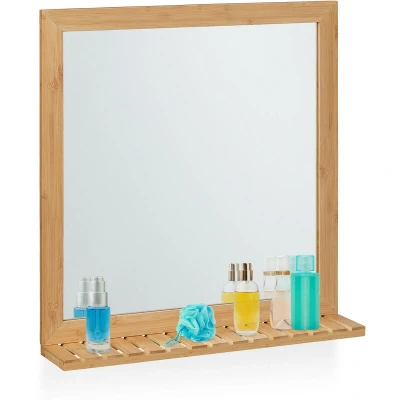 Relaxdays Wall Mirror with Shelf, Bamboo Frame, HxWxD 61.5 x 60 12 cm, Bathroom & Toilet, Hallway Bedroom, Natural