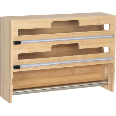 Relaxdays Wall mounted 3 in 1 Roll Holder for kitchen roll, foil & cling film, bamboo, HxWxD: 25x37x10 cm, natural