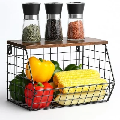 AmazonSpace-saving: Compact iron fruit basket - Open grid design - Perfect for fruit and vegetables Versatile: wall basket for kitchen essentials and spices – perfect for office, bathroom and more. Sleek design: Modern black metal basket with dark brown wood-effect shelf Easy to install: hanging storage basket easily mounts to the wall in just minutes. Basics: Space-saving vegetable rack Overall dimensions HWD: 22x30x20 cm - Hygienic and easy to clean