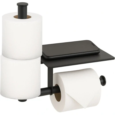 With this wall-mounted toilet roll holder, you not only have your toilet roll always within reach, but you can also unroll it neatly and cleanly. The practical shelf offers space for your mobile phone, keys, or a box of wet wipes and spare rolls. The toilet roll holder is made of sturdy metal and, with its modern design, fits perfectly in your bathroom or guest WC. The open roll holder allows you to load a standard toilet roll in no time at all. Toilet roll holder in detail - Overall dimensions H x W x D: approx. 27 x 28 x 10.5 cm - Material: metal, plastic - Colour: black Additional dimensions of the toilet roll holder - Shelf W x D: approx. 16.5 x 12.5 cm - Rod W x D: approx. 15 x 1.5 cm - Space for roll: approx. 12.5 cm Toilet roll holder with shelf - Made of sturdy, moisture-resistant metal - With shelf for smartphone, wet wipes, air freshener, etc. - For wall mounting using adhesive bracket – adhesive materials included - Easy to change the toilet roll thanks to the removable rod