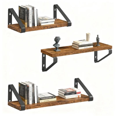 AmazonWall decor: hanging shelves to add living charm, ideal for hallway, kitchen, bedroom and lounge Design: Set of 3 floating shelves – stylish brown wood-effect and black metal Decorative wall shelves in 3 sizes - widths approx 30/35/40 cm - load per shelf approx 8 kg Versatile: wall shelves can be mounted with the shelf at the top or bottom – includes fixings Storage: Wall shelves as decorative home accents – for souvenirs, photos, plants, spices and more.