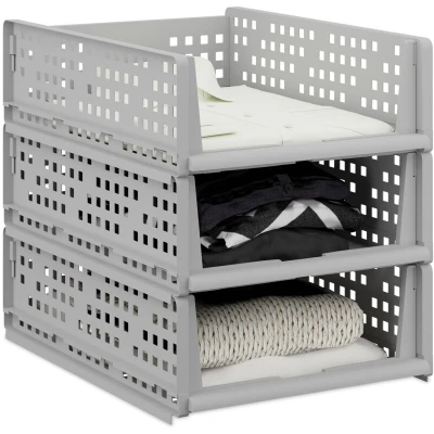 AmazonOrganisation: Grey organisers in a pack of 3 help keep wardrobes, closets and bathrooms tidy Space-saving: Wardrobe storage organisers can be easily stacked - HWD: approx. 13x33.5x43.5 cm Versatile: Storage boxes for jumpers, trousers and more - Also great for towels in the bathroom Practical: Durable closet organisers are easy to assemble and dismantle with click-in design Robust: The wardrobe organiser system is made from plastic - An efficient storage solution