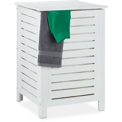 General description The Relaxdays Washing Basket is the perfect solution for storing dirty laundry in your bedroom, bathroom, or basement. This angular linen chest provides ample space for trousers, jumpers, underwear, and more, while the lid keeps everything neatly covered. The removable linen bag adds convenience, as it can be easily washed in the machine when needed. With its natural white pine wood finish, this laundry hamper also serves as a decorative element in your home. Technical specifications Total dimensions (H x W x D): 65.5 x 45 x 45 cm Inner dimensions of bag (H x W x D): 55.5 x 39 x 40 cm Load volume: 86 L Weight: 7.6 kg Material: Pine wood, MDF, fabric (polyester, cotton) Colour: Natural Compatibility and accessories Includes 1x laundry basket in component parts Includes 1x washing bag Comes with instructions and mounting material Decorative items are not included