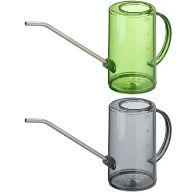 General description With this set of 2 watering cans, you can provide your balcony and indoor plants with sufficient water and create a green oasis of well-being in your home. The long neck enables targeted watering, while the large opening makes filling easy. The large handle allows for easy transport around the home, and the practical scale helps you check the amount of water poured. Technical specifications Dimensions (H x W x D): approx. 19.5 x 10 x 34 cm Volume: approx. 1 litre each Weight: approx. 180 g each Material: Plastic, stainless steel Colour: Grey, green