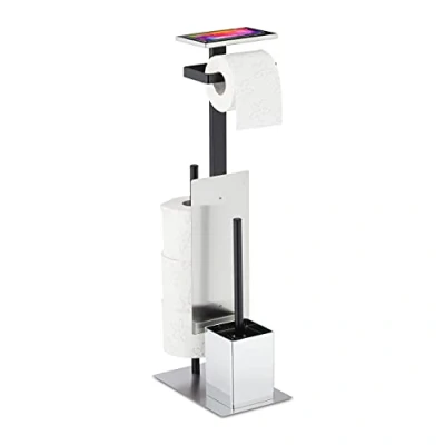 Amazon3 in1: Set made of stainless steel with toilet paper holder, holder for spare rolls and toilet brush Storage: Practical storage surface offers space for mobile phones, smartphones, books or wet wipes Hygienic: Removable brush holder for easy cleaning - Brush head is quickly replaceable Design: Modern toilet paper holder made of stainless steel and plastic brush holder in silver Stable: Secure stand on square base plate - Overall dimensions WC butler HxWxD: 69 x 26 x 18 cm