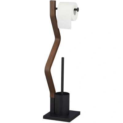 General description With this stylish toilet butler, you always have toilet paper and a toilet brush at hand. Whether in the bathroom or guest toilet, the free-standing toilet set can be placed flexibly and does not need to be attached to the wall. The modern design of the black steel toilet stand combined with dark wood will be a great eye-catcher in your bathroom. Technical specifications Dimensions (H x W x D): approx. 75 x 18.5 x 18.5 cm Base dimensions (W x D): approx. 18.5 x 18.5 cm Weight: approx. 2 kg Material: Steel, wood, plastic Colour: Black, brown Toilet brush holder dimensions (H): approx. 13 cm Toilet brush dimensions (H x Ø): approx. 36 x 8 cm Length of toilet roll holder: approx. 15 cm Height of toilet roll holder: approx. 67 cm Compatibility and accessories Replaceable brush head with a diameter of about 8 cm and an internal thread of about 9.5 mm, compatible with Relaxdays brush head model 10021025. Usage Practical combination of paper and brush holder. Hygienic