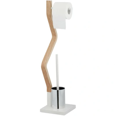AmazonCombi: Complete toilet set with toilet paper holder and brush holder with toilet brush (incl.) Design: Modern toilet roll holder made of robust steel in matt white combined with light wood Hygienic: Removable brush holder for easy cleaning - Brush head is quickly replaceable Design: Modern toilet paper stand made of sturdy steel in matt white combined with light wood Stable: Secure stand on square base plate - Overall dimensions WC butler HxWxD: 75 x 18.5 x 18.5 cm