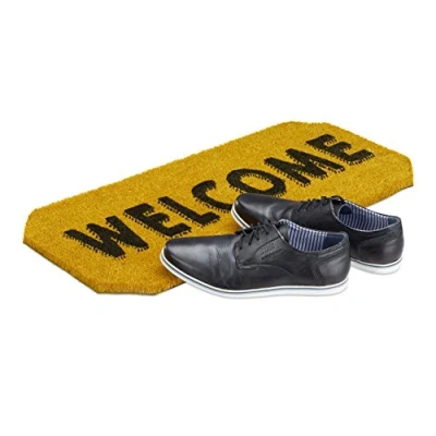 Welcome doormat: Welcome your guests properly with this geometric mat - "WELCOME" text - Door mat for the hallway, patio, porch, basement, garage, house or apartment door Coconut fibre: The natural and sustainable coir material is highly robust, weather-resistant and moisture-repellent Non-slip: Rubber on the bottom of the door mat makes it secure and nonslip - Wipe your shoes before entering your home - Can be used indoors or outdoors Chic and practical: The doormat is a decorative eye-catcher for any entrance - No moisture, dirt or shoe prints enter your home - Simply beat the mat for quick cleaning Basics: Size of the mat: HxWxD: 1.5 x 70 x 33 cm - Weight: ca 1.3 kg - Rectangular shape - Materials: Coir mat with rubber (PVC) backing - Available in various colours