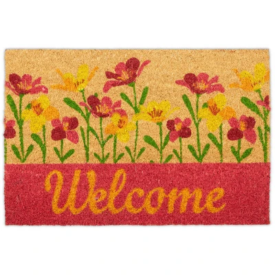 Relaxdays Welcome Flowers Doormat Coir, 40x60 cm, Door Mat Inside & Outside, Non Slip, Rectangular, Coir/Red