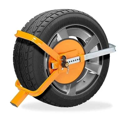 AmazonTheft protection: Parking claw made of robust steel for long-lasting security of your vehicles Versatile: Wheel clamp is ideal for securing cars, caravans, motorhomes and trailers High visibility: Car clamp in bright orange - Thieves are deterred from afar Easy to use: Wheel lock is quick and easy to fit - 3 security keys included Details: Dimensions HxWxD: 48 x 55-68 x 31.5 cm - For 13-15 inch wheels - Max. tyre width: 22 cm