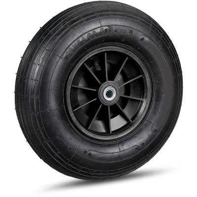 General description If you are in dire need of a replacement wheel for your wheelbarrow, then this pneumatic 4.00-6 tyre is just what you need. This inflatable tyre features a plastic rim, making it incredibly shock-absorbent and easy to maneuver. A contoured surface and needle bearings facilitate pushing even when burdened with high weight. The included adaptors are very handy for making this wheel fit various axle sizes. Technical specifications Tyre size: 4.00-6 Diameter: approx. 32.5 cm Width of wheel: approx. 9.5 cm Weight: approx. 1.6 kg Dynamic capacity: max. approx. 136 kg Static capacity: max. approx. 200 kg Axle inner diameter (without adaptor): approx. 2.5 cm Hub length: approx. 77 cm Adaptor inner diameter: approx. 2.2, 1.7, 1.3 cm Rim diameter: approx. 16.5 cm Material: Plastic, nylon, rubber, and steel Compatibility and accessories Includes 3 adaptors for various axle sizes Other information Inflatable wheelbarrow tyre for easy movement in uneven terrain Needle bearings
