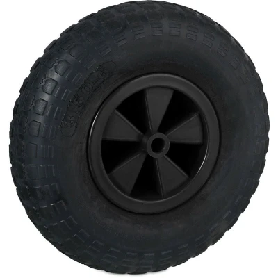 With the solid rubber wheelbarrow tyre, you get a puncture-proof wheel for your garden wheelbarrow at home. The wheelbarrow tyre without air is resistant to thorns, nails and other sharp objects and has low rolling resistance, which ensures easy handling. The solid rubber tyre is always ready for use as there is no risk of losing air after a long period of use. The robust plain bearing makes the complete tyre particularly resistant to impact loads. Wheelbarrow Wheel in Detail - Tyres: 3.50-6" - Wheel diameter: approx. 33 cm - Wheel width: approx. 9 cm - Load capacity: approx. 100 kg - Weight: approx. 1.4 kg - Material: Solid rubber (PU), plastic - Colour: Black Spare Wheel without Axle - Inner diameter for axle: approx. 1.7 cm - Hub length: approx. 9 cm - Rim diameter: approx. 17 cm Puncture-proof Rubber Tyre - Made of solid rubber for low rolling resistance - Insensitive to shards, rubbish and much more - Robust plain bearing with good impact resistance - Tread with grooved tread