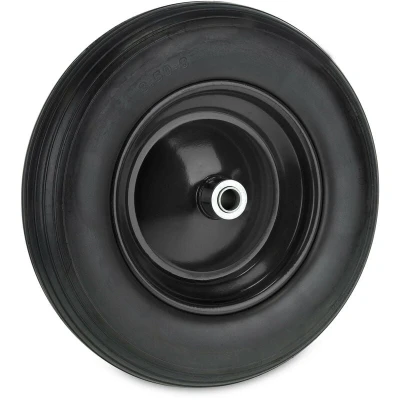 This replacement wheel made from solid rubber is a puncture-proof solution for your home wheelbarrow. The spare tyre is resistant to thorns, nails and other sharp objects and has low rolling resistance, which ensures easy handling. What is more, this rubber wheel is also always ready to go, since there is no danger of air loss over time. The robust ball bearings of the solid tyre ensure your wheelbarrow is easy to manoeuvre thanks to low friction. Wheelbarrow Wheel Details - Tyre: 3.50-8 - Wheel diameter: approx. 37 cm - Wheel width: approx. 8.5 cm - Load capacity: approx. 100 kg - Weight: approx. 1.8 kg - Material: Solid rubber (PU), steel - Colour: Black, Replacement Wheel without Axle - Inner diameter for axle: approx. 2 cm - Hub length: approx. 11 cm - Wheel centre diameter: approx. 22 cm Puncture-Proof Rubber Tyre - Made from solid rubber for low resistance - Resistant to glass shards, debris etc. - With ball bearing for easy handling - Contoured surface for grip and control