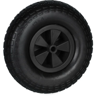 This replacement wheel made from solid rubber is a puncture-proof solution for your home wheelbarrow. The spare tyre is resistant to thorns, nails and other sharp objects and has low rolling resistance, which ensures easy handling. What is more, this rubber wheel is also always ready to go, since there is no danger of air loss over time. The robust bearings of the solid tyre ensure your wheelbarrow is shock-resistant. Wheelbarrow Wheel Details - Tyre: 4.00-6 - Wheel diameter: approx. 33 cm - Wheel width: approx. 9 cm - Load capacity: approx. 100 kg - Weight: approx. 1.6 kg - Material: Solid rubber (PU), plastic - Colour: Black Replacement Wheel without Axle - Inner diameter for axle: approx. 1.7 cm - Hub length: approx. 9 cm - Wheel centre diameter: approx. 17 cm Puncture-Proof Rubber Tyre - Made from solid rubber for low resistance - Resistant to glass shards, debris etc. - With bearings for shock-resistance - Contoured surface for grip and control - Spare tyre for wheelbarrows,