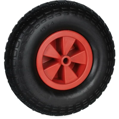 This replacement wheel made from solid rubber is a puncture-proof solution for your home wheelbarrow. The spare tyre is resistant to thorns, nails and other sharp objects and has low rolling resistance, which ensures easy handling. What is more, this rubber wheel is also always ready to go, since there is no danger of air loss over time. The robust bearings of the solid tyre ensure your wheelbarrow is shock-resistant. Wheelbarrow Wheel Details - Tyre: 4.00-6 - Wheel diameter: approx. 33 cm - Wheel width: approx. 9 cm - Load capacity: approx. 100 kg - Weight: approx. 1.5 kg - Material: Solid rubber (PU), plastic - Colour: Black, red Replacement Wheel without Axle - Inner diameter for axle: approx. 1.7 cm - Hub length: approx. 9 cm - Wheel centre diameter: approx. 17 cm Puncture-Proof Rubber Tyre - Made from solid rubber for low resistance - Resistant to glass shards, debris etc. - With bearings for shock-resistance - Contoured surface for grip and control - Spare tyre for wheelbarrows,