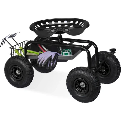 Relaxdays Wheeled Garden Seat, Height Adjustable, 150 kg Capacity, Storage for Tools, Steel, Pneumatic Tyres, Black