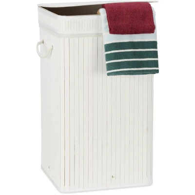 AmazonWhite laundry bag: Removable washable cloth lining and practical side handles Foldable: The basket can be folded with 70 L and save space Ventilation: The holes on the ground prevents mould - Stable stand thanks to base plate Easy-care: The bamboo material is humidity proof and easy to care for Basics: Size of the hamper HWD: 63 x 36 x 36 cm - Very light with app. 1.8 kg