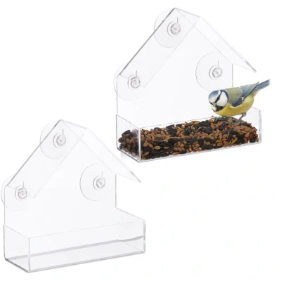 General description With these feeding stations, you can make wild birds happy in winter or during the warmer months. The bird feeders are easily attached to the window pane with three suction cups, offering birds an easily accessible food dispenser. Each feeder features a practical roof and is made from transparent plastic, allowing you to watch the birds as they eat, drink, or bathe from inside. Technical specifications Dimensions (H x W x D): approx. 15 x 15 x 7 cm Inner dimensions of feeding trough (H x W x D): approx. 3.5 x 14.5 x 5.5 cm Feeding trough capacity: approx. 300 ml each Weight: approx. 120 g each Material: Acrylic (plastic), PVC Colour: Transparent Other information Bird feeders in a set of 2 Easy to hang on the window pane thanks to 3 suction cups each Small feeding stations with roof and feeding trough Easily accessible feeding station in cottage design Plastic feeders are easy to clean