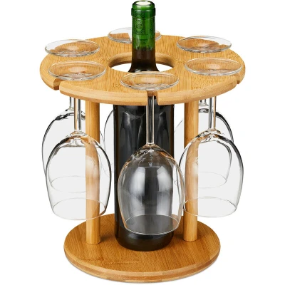Relaxdays Wine Holder, Space for 6 Glasses and Bottle in The Middle, Round Ø 25cm, Elegant Gift Idea, Bamboo, Natural, 25 x cm