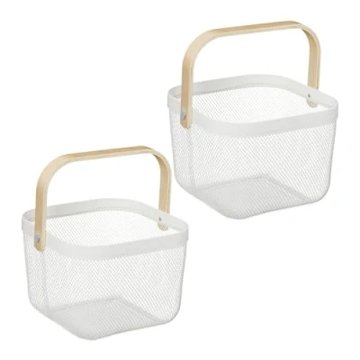 Relaxdays Wire Baskets with Handle, Set of 2, Metal & Bamboo, HxWxD: 17.5 x 26 24.5 cm, Stylish Storage, White