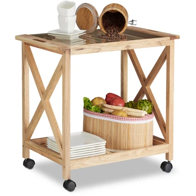 Relaxdays Wooden Kitchen Cart with Wheels, Serving Trolley Glass Top, 2 Tiers, HxWxD: 63 x 66.5 38 cm, Natural