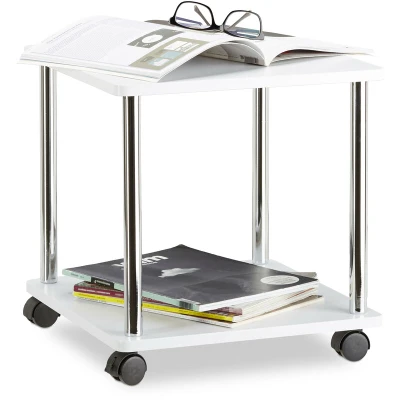 General description This small side cart is a true jack of all trades. It can be used as a coffee table in your living room, a side cart, a plant stand, or even as a kitchen trolley. This white 2-tier cart is incredibly versatile and mobile, featuring 4 plastic castors that protect your floor and allow for easy maneuverability. Technical specifications Material: MDF, stainless steel, and plastic Dimensions: H x W x D: 41.5 x 40 x 40 cm Distance to floor: approx. 5 cm Length per bar: approx. 33.5 cm Height per tier: approx. 1.5 cm Capacity: approx. 5 kg Weight: approx. 4.3 kg Color: White Installation No tools required for assembly Includes assembly materials and instructions Usage Mobile plant stand Coffee table for couch or sofa Side cart for storage Portable due to 4 plastic wheels Other information Decorative items shown in product photos are not included