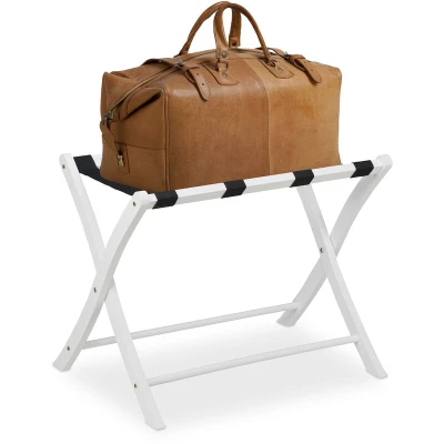 AmazonHandy: Stand for heavy suitcases and travel luggage - a great helper for hotels and motels Basics: Wooden luggage stool with 4 straps - size HxWxD: approx. 52.5x66.5x48 cm - in white Convenient: Luggage rack at a comfortable height for packing and placing bags - with flexible straps Space-saving: Foldable luggage rack - easy to store and transport Stable: Solid wooden cross frame for a firm stand - case holder quick and easy to assemble