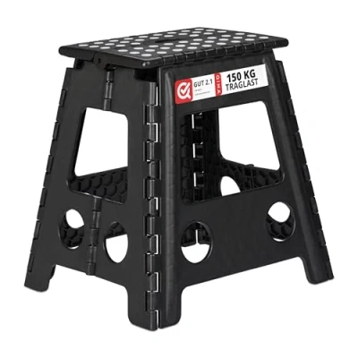 AmazonFoldable: Large folding stool made of easy-care plastic - 39.5 cm Tall - Black Compact: Folds for storage - Perfect as bathroom or camping stool Portable: Lightweight with handle for easy transport Household helper: Step ladder to reach shelves - Capacity app. 120 kg Practical: As bathroom seat for parents and kids alike - Quick setup