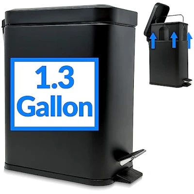 Compact Size: Reli.'s small trash can with lid measures out to 10'' L x 5.5" W x 11.5" H and holds up to 1.3 gallon (5 liters). Its slim size makes it convenient to place anywhere especially in small spaces. Works great with our Reli. 1-2 Gallon Trash Bags (see below)! Quality Material: Made of strong stainless steel metal with a durable matte black finish and a soft, slow close lid that is silent. Removable Inner Bucket: Each trash can has an easy to remove inner bucket with a metal handle, providing hassle-free waste disposal when its reached capacity, quick clean up and also making it convenient when inserting or swapping a small trash bag. Convenient Step Pedal: Our trash bin has a non-slip pedal to open the lid making it hands-free, user-friendly & safe. Modern Styled Trash Bin: Enhance the decor in your office, bathroom, kitchen, bedroom, or any space with our modern design trash can that has a rectangular shape, round edges, and sealed lid.