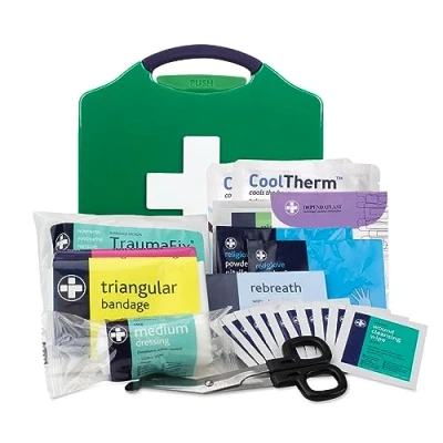 Medium kit for use in cars, taxis, vans and trucks with up to 8 passengers. Contains triangular bandage, adherent dressing pad, HSE medium dressing, medium trauma dressing.