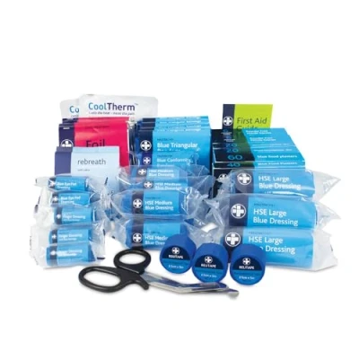 Large-Scale Compliance: This refill caters to large catering establishments, providing enough supplies for 100 low-risk or 25 high-risk employees as per BS8599-1 standards What's Included: 2 Bandages, Blue Conforming 4 Bandages, Blue Triangular 2 Dressings, Burn 4 Dressings, Blue Eye Pad 4 Dressings, Blue Finger 6 Dressings, Blue HSE Medium 4 Dressings, Blue HSE Large 3 Foil Blankets, Adult 12 Gloves, Blue Pairs 1 Guidance Leaflet 100 Plasters, Blue Assorted 2 Resuscitation Face Shields 1 Shears 3 Tapes, Blue Microporous 40 Wipes, Blue Cleansing Seamless Integration: Designed to fit perfectly into your existing first aid box, making the refill process quick, efficient, and hassle-free Maintain Readiness: Keep your first aid kit up to date with this essential refill, serving as a crucial HSE backup for your catering business Cost-Effective Solution: Refresh your first aid supplies without the need to replace the entire kit, providing a practical and economical way to maintain workplace safety compliance