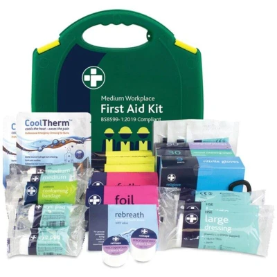General description An essential for any workplace, the Reliance Medical First Aid Kit is equipped to handle common everyday accidents and injuries. This Medium Workplace First Aid Kit is suitable for low-risk workplaces with 25-100 employees or high-risk workplaces with 5-25 employees. Technical specifications Compliant with BS8599-1: 2019 Durable polypropylene case Wall mountable with integrated bracket Contents 2 x conforming bandage 2 x triangular bandage 2 x burn dressing 3 x eye pad dressing 3 x finger dressing 4 x HSE medium dressing 3 x HSE large dressing 2 x adult foil blanket 9 x pairs of gloves 1 x guidance leaflet 60 x assorted washproof plasters 1 x resuscitation face shield 1 x shears 2 x microporous tape 30 x cleansing wipes