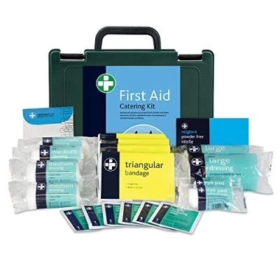 HSE basic food hygiene catering first aid kit in standard hazard conditions Covers up to 10 people, minimum level first aid standard Compliant with Health and Safety (HSE) regulations Standard economic durable carry case Ideal for small kitchens and the catering industry