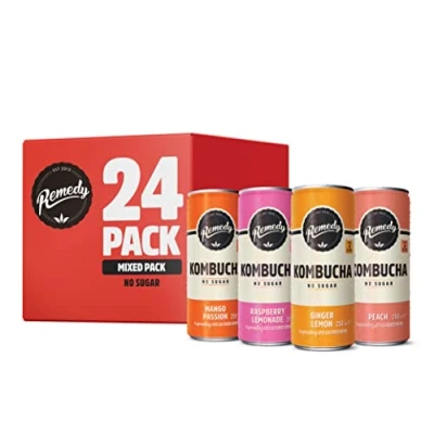 ❤️WHAT A GREAT MIX - Try these wonderfully fruity Remedy Kombucha flavours. This mixed pack includes; Ginger Lemon, sweet Raspberry Lemonade, delicious Peach and fruity Mango Passion! A great alternative to sugar laden fizzy drinks, have a remedy with breakfast, take to dinner with friends or enjoy on your next road trip. It's always a good time to reach for a Remedy! 🤷KOM-WHAT-CHA? - Remedy Kombucha is a healthy & tasty natural soft drink, made by naturally fermenting sweet tea with a live culture. 🥣MADE THE TRADITIONAL WAY - Remedy kombucha is handcrafted in small batches, our SCOBY (Symbiotic Culture Of good Bacteria and Yeast) is delicately brewed for 30 days. The result is a sparkling drink that contains live-cultures, tea polyphenols, organic acids and is naturally sugar-free. 🍃RAW, UNPASTERISED INGREDIENTS - Our live cultured drinks are always raw and unpasteurised to maintain all of their gut-loving, healthy, probiotic goodness. 👌A-OK IN OR OUT OF THE FRIDGE - No sugar = no refermentation. Remedy drinks are a-ok in or out of the fridge. Pop them in the fridge to chill out before you drink them - they taste better cold!