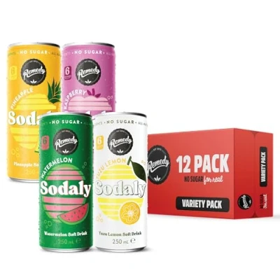 What Is Sodaly? - From the makers of Remedy Kombucha, Sodaly is a super tasty, guilt-free fizzy drink packed with gut lovin' goodness Full On Flavour - From seriously tasty to super refreshing, discover each of our Sodaly flavours with this mixed pack of delicious soft drinks Sugar Free Fizz - Each 250ml can of our great tasting soda pop contains no sugar (for real!) or artificial sweeteners - just all-natural fruit flavour and a burst of fizz Gut Friendly Prebiotics - Made with a base of apple cider vinegar, Sodaly contains prebiotics that feed your good gut bacteria to support overall gut health Low Calorie - At just 8 calories per can, Sodaly is big on flavour and low on guilt - so you can feel good about enjoying a satisfying and invigorating can of pop