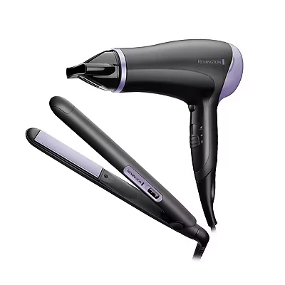 Get perfectly styled tresses with this Remington hair dryer and straightener set. With a 2000 W dryer in your hands, you'll be on your way to perfect hair days in no time. Ceramic and ionic technology leaves your hair feeling healthy and moisturised, keeping frustrating frizz at bay. Finish off your style with the straighteners - they'll be ready to use in just 30 seconds. The slim floating plates are ceramic coated, so they heat-up evenly and glide effortlessly through your locks. Fab-u-lous!Good to know- Get stunning straight results from the dryer with the help of the fast dry concentrator- The dryer has a choice of 3 heat and 2 speed settings, so you can pick what's best for your hair type- A cool shot gives a finishing touch to keep your hair looking flawless all day- The straighteners heat up to 215°C, so you can set the best temperature for your hair