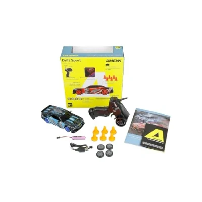Switchable underbody lighting: gives a unique style and enriches the driving experience with cool show effects when drifting LED lighting: highlights the sporty character, provides the right atmosphere in dark rooms or outside at dusk Additional wheels with rubber tyres: model can be quickly transformed into a fast-paced racing car Interference-free 2.4 GHz system, RTR set (ready-to-run) including remote control, battery, charging cable Matching battery for long driving times of up to 20 minutes, up to 15 km/h top speed, six pylons included, Manufacturer: Amewi