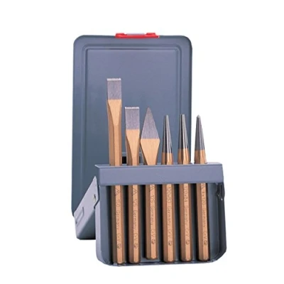 With polished blades Material: Chrome-Vanadium steel Content: 2x Flat cold chisel, 1 Crosscut chisel, 1 Centre punch, 2x Taper punch, Weight: 0.7 Kilograms, Manufacturer: Rennsteig