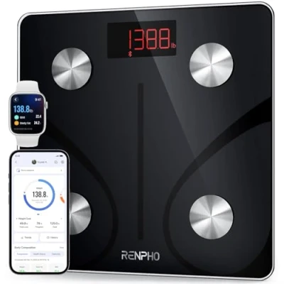 500lbs capacity and extra-wide platform. Created with 4 high-sensitive sensors, the smart scale can instantly deliver precise measurements in 0.2lb (0.05kg) increments with up to 500lbs capacity. The large platform (12 x 12 inches) accommodates different foot sizes and provides more stability and comfort when stepping on it. Renpho health app works in connection with fitness apps. Easy setup app works with Myfitnesspal, Samsung Health, Fitbit App and Apple Health. Renpho already has millions of happy global users. 13 essential body measurements. Body weight shows on the digital scale, other body composition data including weight, BMI, body fat percentage stored in the app. Track everybody's metrics change on Renpho health app. User-friendly app. Download Renpho Health App at App Store or Google Play, also works with Apple Watch (Except for Apple Watch Series 1). Renpho Health App works with Bluetooth 4.0 And above. Monitor your progress, unlimited users and baby weighing mode. Renpho scale connects with apps to help motivate toward your goals, save historical data, and track your daily, weekly, and monthly progress. Use baby weighing mode for weighing baby or pets, 1 scale for whole family, support for adding unlimited users.