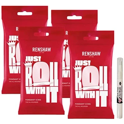 Renshaw Baby Pink Ready to Roll Fondant Icing 1kg (4X 250g) and Rainbow Dust Edible Glue Brush