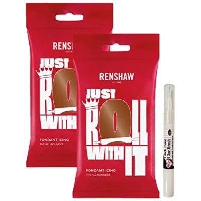 Renshaw Dark Brown Ready to Roll Fondant Icing 500g (2X 250g) and Rainbow Dust Edible Glue Brush