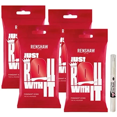 Renshaw Poppy Red Ready to Roll Fondant Icing 1kg (4X 250g) and Rainbow Dust Edible Glue Brush