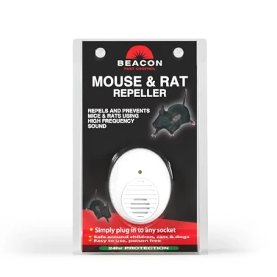 Beacon Battery Mouse Repeller Repels mice and rats Uses Ultrasonic frequencies Safe for children and pets Battery operated The Beacon Ultrasonic Mouse Repeller operates using one 9V battery - no plugs needed. This makes it completely portable, and ideal for lofts, garages, sheds, caravans, conservatories, summer houses and static homes. It is poison-free, meaning that it is safer around children, cats, and dogs.