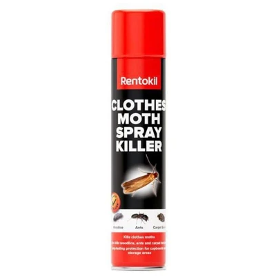 Rentokil Clothes Moth Spray Killer. A surface spray to kill clothes moths in the home. Long-lasting protection for cupboards and storage areas. Contains Cyphenothrin and Prallethrin.