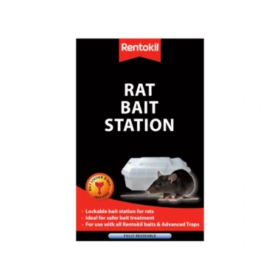 General description The Rentokil Rat Bait Station RKLFBSR02 is a secure, reusable container designed to hold rat bait safely out of reach of children, pets, and non-target animals. It is compatible with all Rentokil baits and can also accommodate a Rentokil Advanced Rat trap, ensuring effective pest control. Technical specifications Type: Bait Station Use For: Rats Material: Durable plastic Reusability: Fully reusable MPN: FBSR02 EAN: 5012607008063 Compatibility and accessories Compatible with all Rentokil rat baits Can hold a Rentokil Advanced Rat trap Supplied with a key for secure access Installation Place the bait station in areas where rat activity is observed Ensure the station is stable and accessible for bait placement and inspection Usage Use with appropriate rat bait or trap as per instructions Keep the station locked when not in use to prevent unauthorized access Other information