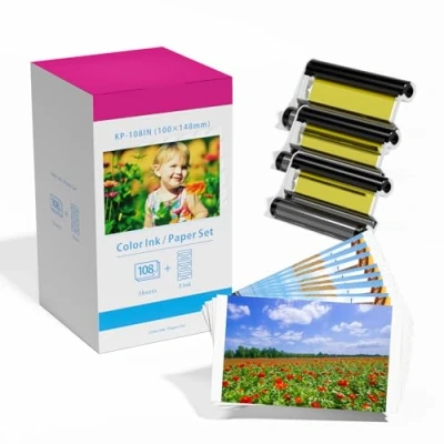 Unlock vibrant memories with our complete kit: replacement for canon selphy KP-108IN photo papers, featuring Airmall 3 premium ink cartridges and 108 sheets of high-quality photo paper. Perfect for creating postcard-sized prints at 100mm x 148mm (4" x 6"), ideal for office professionals and home users seeking effortless, professional results. Experience extraordinary, long-lasting colour with advanced dye sublimation technology. The KP-108IN Paper sheets deliver fade-resistant prints that preserve your cherished moments for decades, ensuring vibrant photos every time. KP-108IN Paper sheets are replacement for Canon Selphy CP series photo Printers, including models like CP100, CP200, CP220, CP300, CP330, CP400, CP510, CP600, CP710, CP720, CP730, CP740, CP760, CP770, CP780, CP790, CP800, CP810, CP820, CP900, CP910, CP1000, CP1200, CP1300, CP1500. Enjoy reliable printing without compatibility hiccups. The KP-108IN bundle is your ultimate solution for on-demand photo printing anywhere—whether at home, in the office, or on the go. Create stunning, colourful pictures directly from your printer with ease and efficiency. Essential tips: Always use a selphy CP Series printer (not compatible with QX10 models), avoid touching the glossy print area, install cartridges after powering on to prevent ribbon waste, and note each sheet is single-use only—never reuse for flawless results.